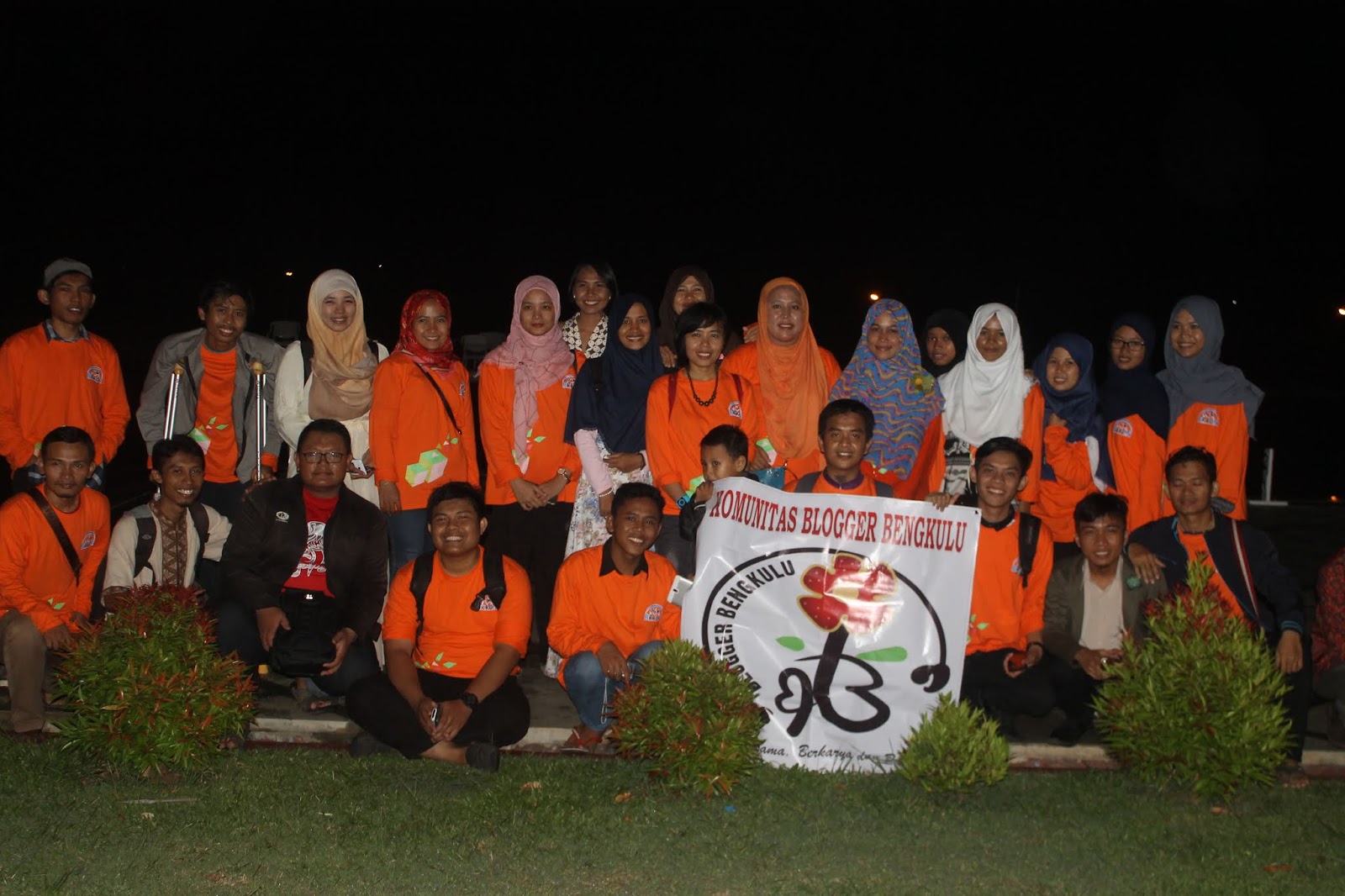 Senang saya bercampur bingung. Bagaimana mungkin mengumpulkan puluhan blogger di Bengkulu? Apa ada? Alhamdulillah berkat kerjasama semuanya acara nangkring bareng kompasiana itu berjalan lancar. Satu hal yang bikin saya tambah senang ternyata Blogger Bengkulu itu banyak loh. Cuma nggak terkumpul aja. Saat itu juga saya dan mba milda chitchat. Katanya ini bisa jadi momen kita membentuk komunitas yang sudah lama beliau harapkan juga. Tentu saja saya setuju banget. Mbak Milda yang baru lahiran itu rela-relain datang dan mengurus spanduk yang sudah ada logo Blogger Bengkulunya loh. Salut deh, dan setelah acara nangkring kami berfoto bersama untuk mendandakan terbentuknya Blogger Bengkulu. Tanda lainnya juga adalah TERCEBUR nya SAYA KE KOLAM. Ya Allah, cemas banget waktu itu laptop, kamera, handphone nyemplung sama tas semuanya. Tapi Alhamdulillah nggak rusak-rusak amat dan terobati karena menang lomba menulis acara nangkring saat itu.