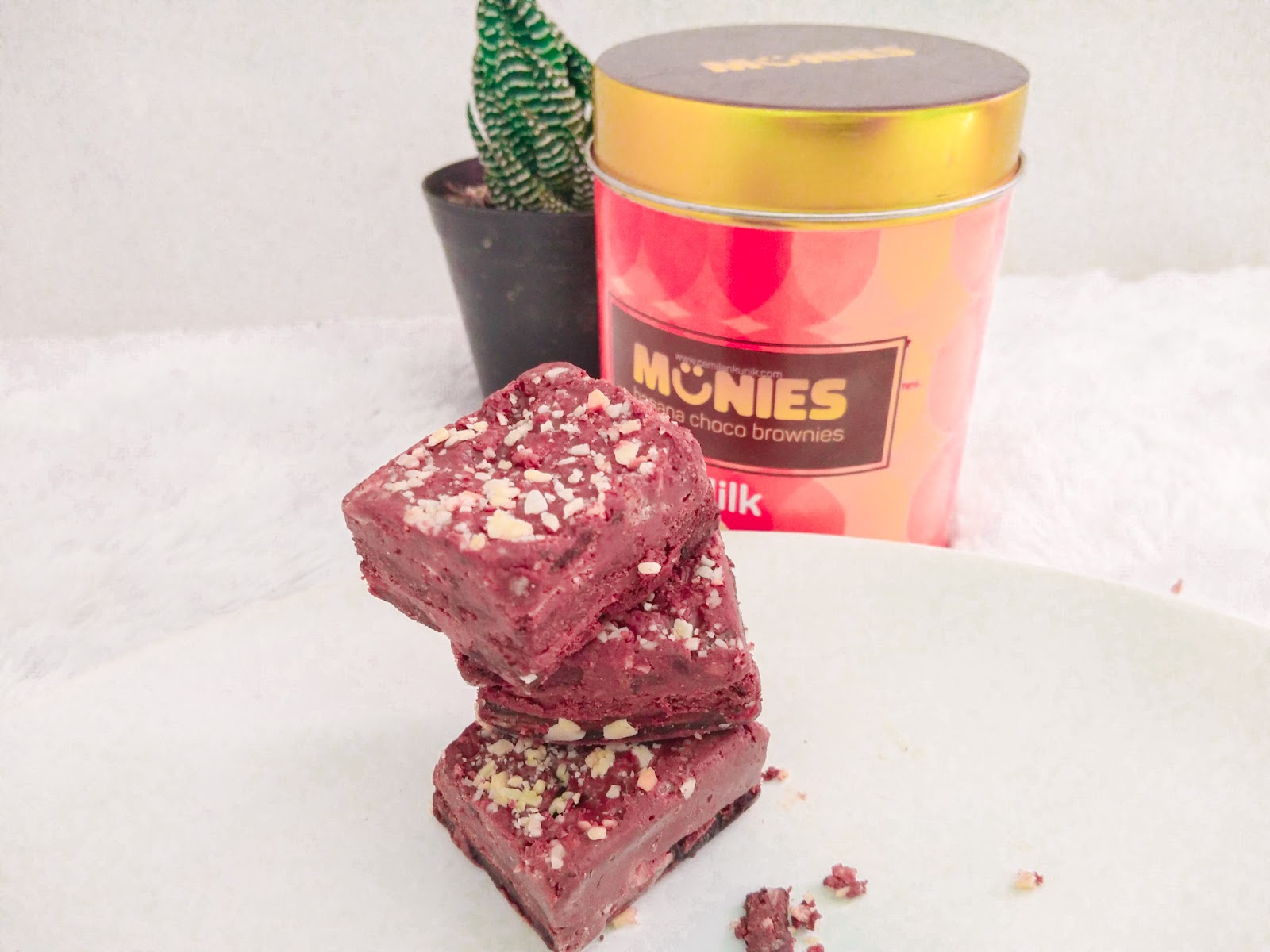 Ini favorit saya juga. Munies adalah brownies coklat pisang preium yang legit dan kenyal ketika dikunyah. Sensasi lembut, chuwy dan crunchy berpadu karena isian sale pisang berbalut dark coklat berlapis serta butiran gurih kacang almond. Ada rasa coffee, milk dan dark.