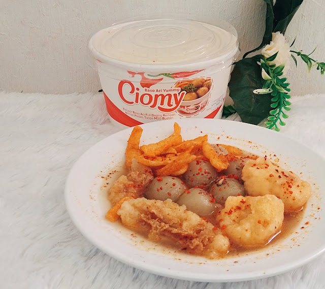 Ciomy memiliki tekstur yang kenyal dan terbuat dari bahan alami berkualitas. Ciomy memiliki cita rasa gurih yang alami dan saat bakso aci nya digigit ada surprise daging. Selain itu ciomy juga menggunakan minyak ebi untuk memperkaya cita rasa. Kemasannya dibuat unik agar memudahkan untuk dibawa kemana-mana. Saya memesan Ciomy cup. Isiannya ada bakso acy, rempah, garam Himalaya, minyak ebi, cabe bedas, taburan kacang gurih dan topping D Tella Hot.