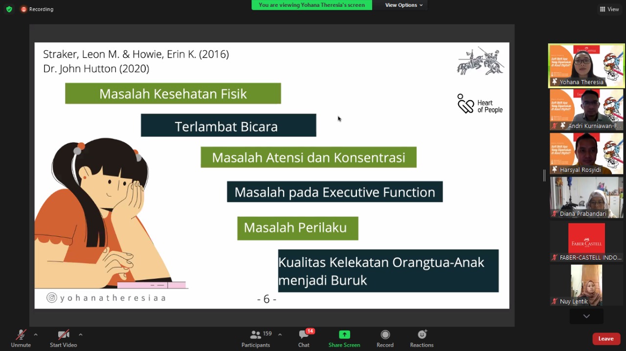 Sebagai orang tua juga kita patutnya terus memperkaya ilmu dalam membersamai si kecil. Alhamdulillah, di hari Sabtu, 25 September 2021 saya mengikuti webinar parenting yang diadakan oleh Faber Castell bertemakan “Soft Skill Apa yang Dibutuhkan di Era Digital”. Kegiatan ini menghadirkan Yohana Theresia, M.Psi., Psikolog dari yayasan Heart of People.id