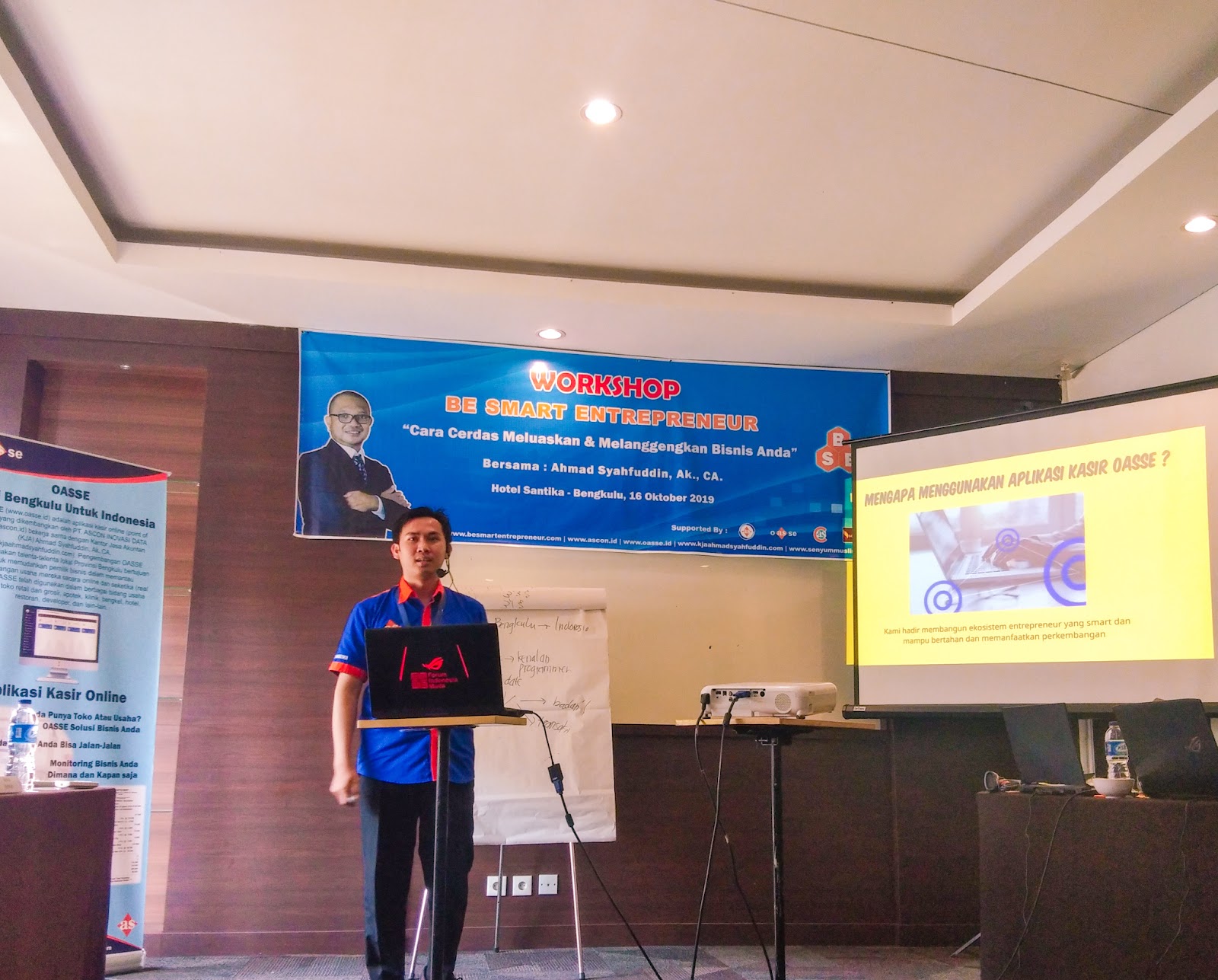 Untuk menjadi smart entrepreneur ada beberapa hal yang harus dilakukan. Hal ini disampaikan oleh Bapak Ahmad Syahfuddin, Ak., CA, yang merupakan Direktur Utama PT. Ascon Inovasi Data dalam Workshop Be SMART Entrepreneur di Hotel Santika Bengkulu (16/10).