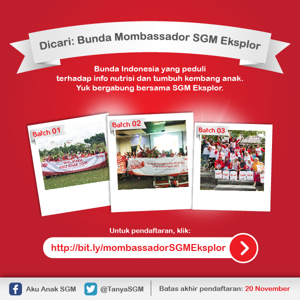 Nantinya jika terpilih akan mendapatkan pelatihan secara berkala mengenai parenting, nutrisi, tumbuh kembang anak, dan masih banyak lagi. Khusus untuk Mombassador SGM Eksplor 2016 akan diundang ke Yogyakarta dalam acara Temu Bunda 13-15 Desember 2016.